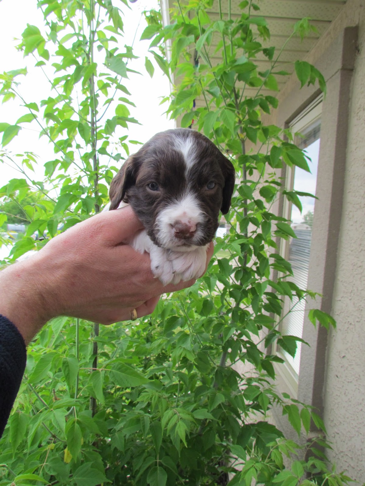 We call this guy Rocky. He has become one of the playful pups this week. He is constantly trying to get the others to fight. And he has the cutest stance that I haven't been able to capture on camera yet. He is already getting into the attack/play stance with his front feet down, his head down, with his butt in the air. Tail is always going. And he has his long tail still, which the other puppies are discovering is fun to play with!